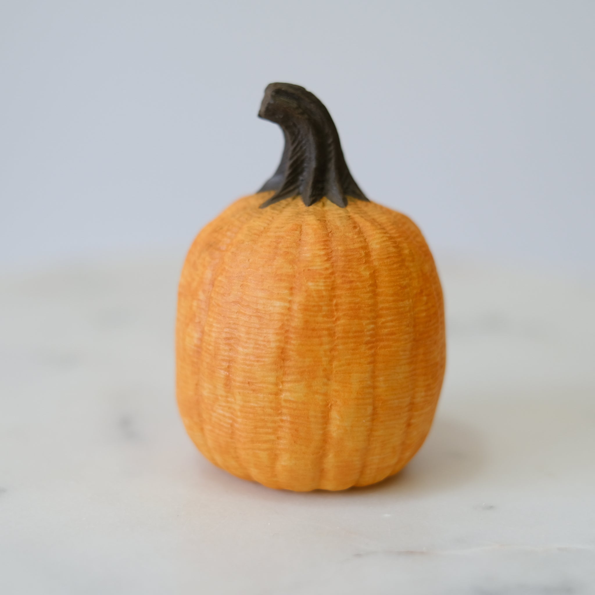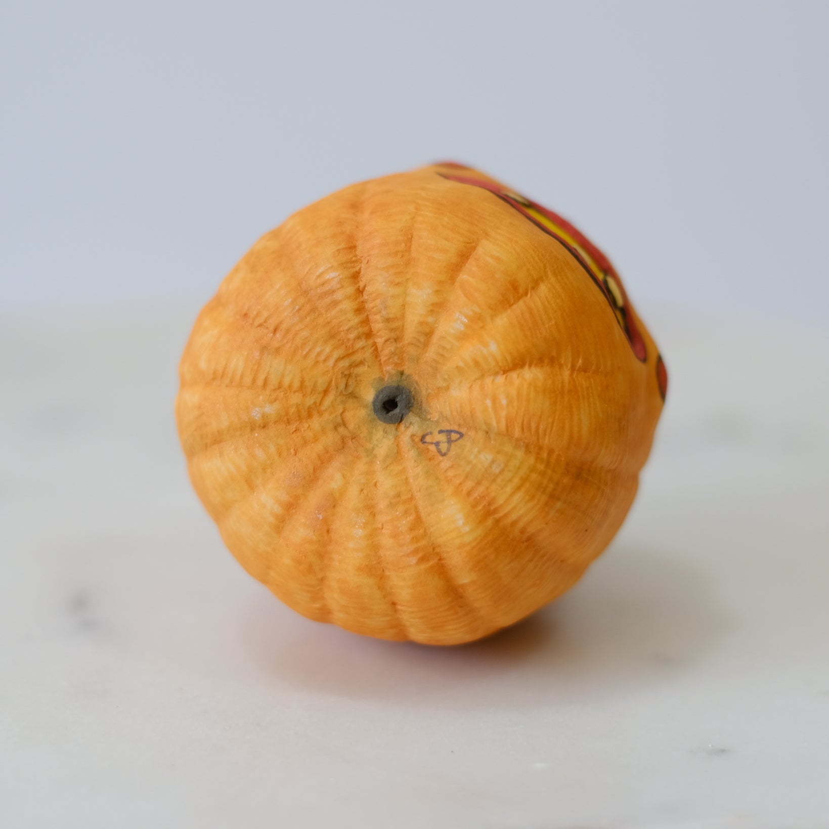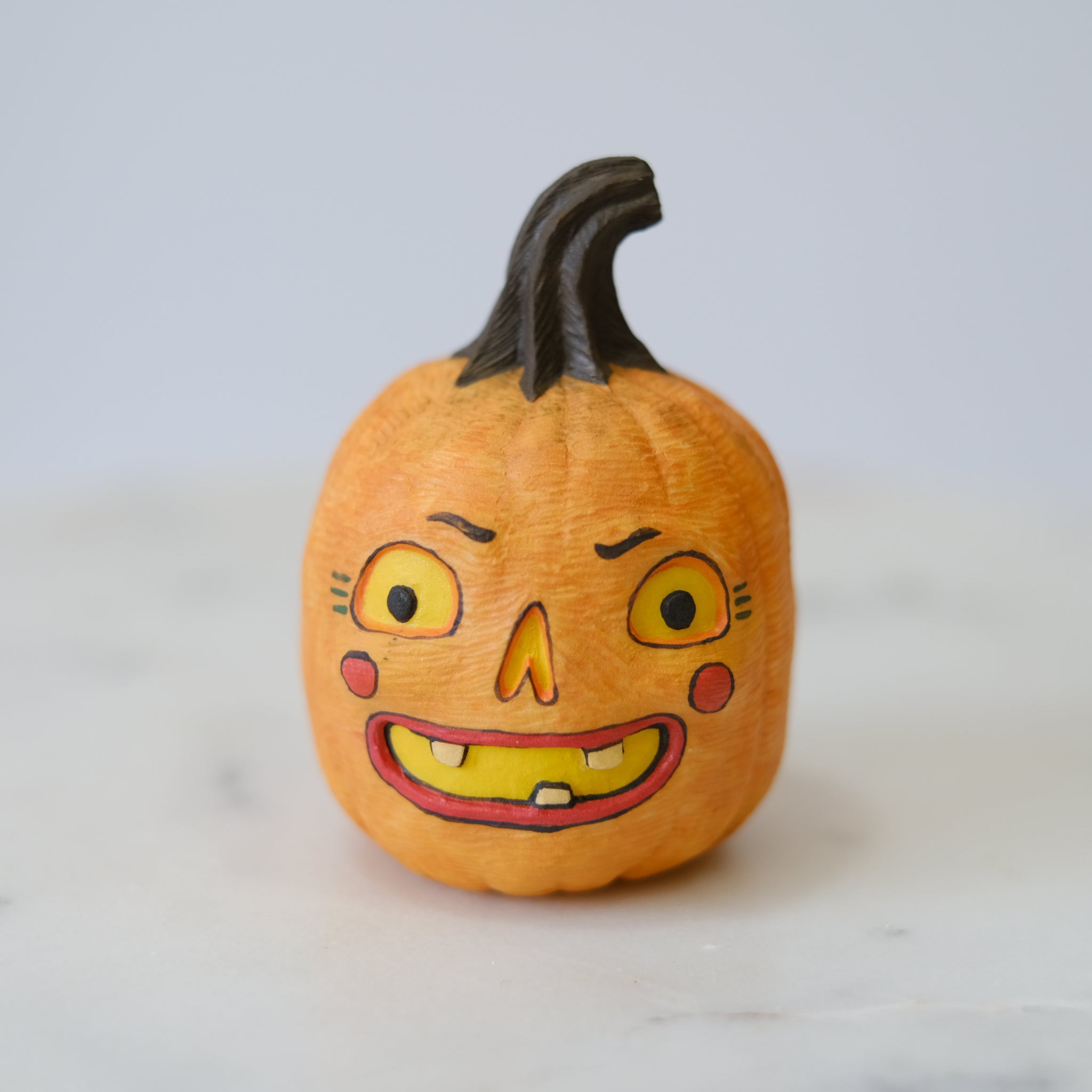 The largest pumpkin in the patch this year stands 2.5 inches tall. This vintage jack-o-lantern inspired pumpkin features a carved face with a slightly menacing expression and a textured skin.